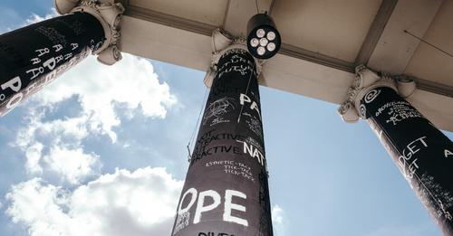 The columns of the Fridericianum Museum, one of Documenta’s main exhibition spaces, wrapped with a work by the Romanian artist Dan Perjovschi.Credit...Felix Schmitt for The New York Times