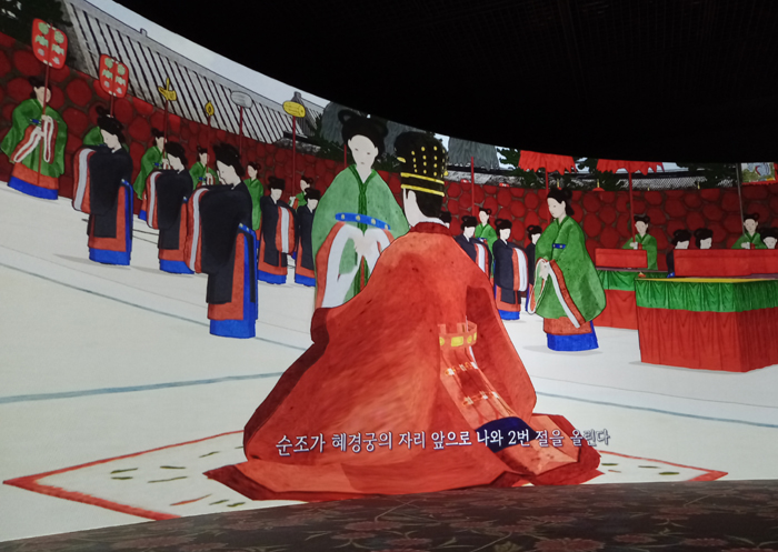 외규장각 의궤 중 영국국립도서관이 구매하여 소장하고 있는 기사진표리진찬의궤를 실제와 똑같이 복제하여 관람객이 직접 넘겨보며 어람용 의궤의 품격을 느낄 수 있도록 하였다. 그리고 너비 10m의 대형 화면에서 디지털 콘텐츠로 변신한 기사년의 <진찬의 3D 영상>을 감상하면서 관람객은 왕실 잔치의 손님이 된다. * 여령女伶: 전문 예인藝人으로 의례 중에 행사의 진행을 돕던 사람