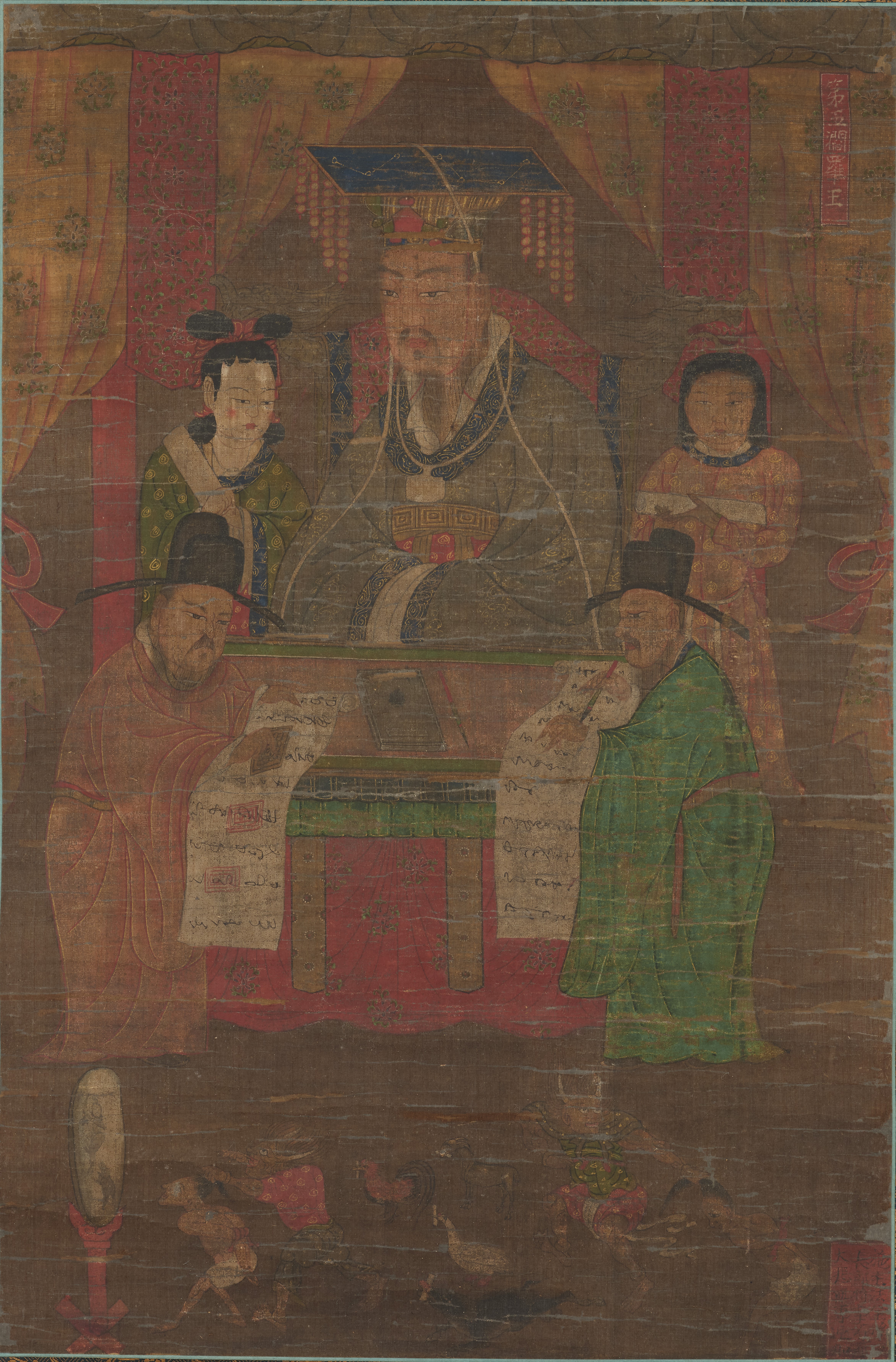 이번 전시에서는 ‘시왕도’ 중 제5 염라왕, 제6 변성왕, 제8 평등왕 그림을 소개한다. 염라왕은 사람이 죽은 후 다섯 번째 7일에 만나는 왕이다. 죽은 이는 염라왕 앞에 가면 머리채를 잡혀 거울 앞에서 그동안 지은 죄를 비춰 본다고 하여 염라왕 그림에는 언제나 업경業鏡이 그려진다. 이번에 공개하는 염라왕 그림에도 죄인이 옥졸에게 이끌려 거울에 죄를 비춰 보는 모습이 그려져 있다. 이 거울에는 네발짐승을 죽이는 모습이 비춰지고 죄인 주변에 소, 닭, 오리 등의 동물이 그려졌는데, 이는 고려시대 이후 우리나라 시왕도에서 자주 나타나는 특징이다.