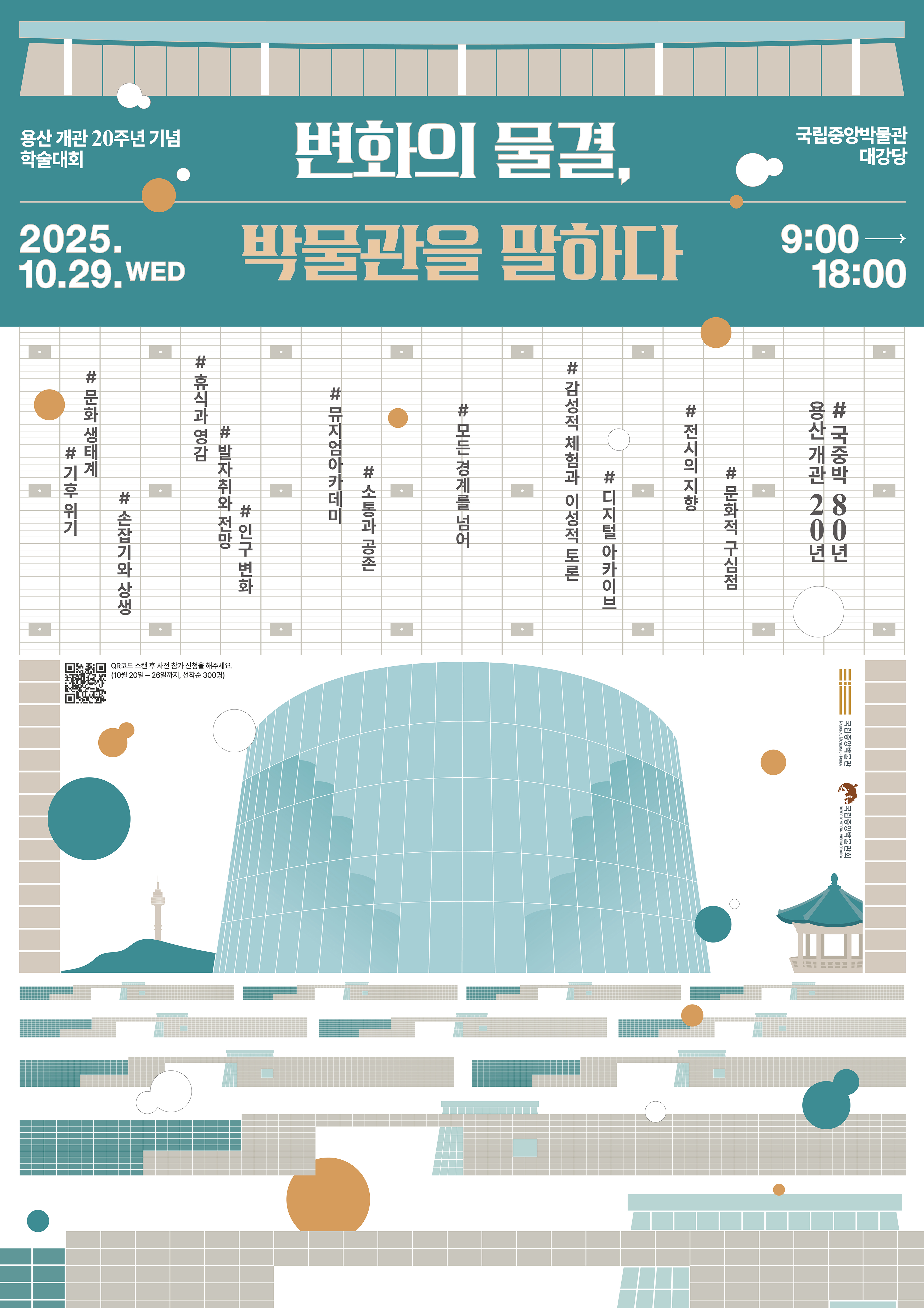 붙임 1. 학술대회 <변화의 물결, 박물관을 말하다> 포스터 2. 전문가 콜로키움 <기후 위기와 박물관의 미래> 포스터 3. 국립중앙박물관 사진 4. 주요 발표자 사진 5. 학술대회 및 콜로키움 사전 참가 신청 QR 코드