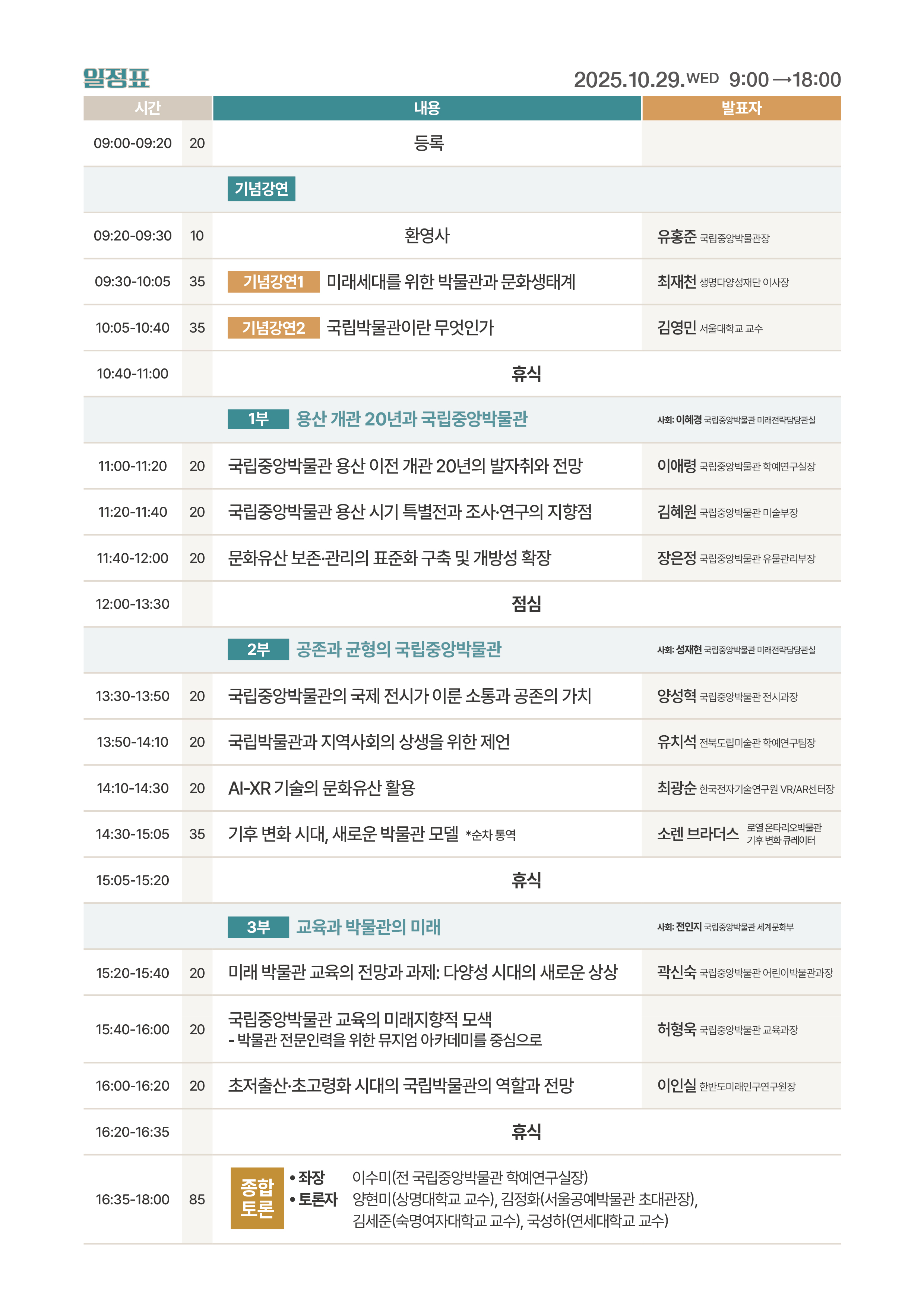 제1부 ‘용산 20년과 국립중앙박물관’에서는 2005년 용산 개관 이후 국립중앙박물관이 걸어온 여정과 다가올 새로운 20년을 준비하는 발표가 이어진다.