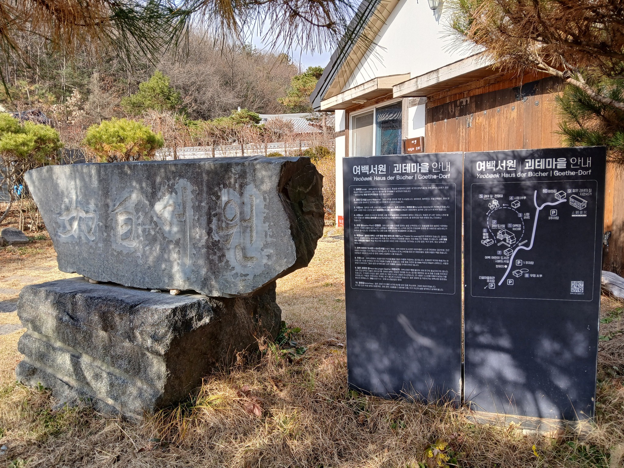 1<경기도 여주> 괴테의 집 유럽식과 여백 서원 한국식이 다 있는 공간이다 교통은 불편한 편이다 // 여백서원 설립자는 <전영애> 서울대 독어독문학과 명예교수 그는 괴테 연구의 대가로 알려져 있으며, 2014년 맑은 사람을 위한 서원이라는 뜻을 담아 여주에 여백서원을 설립 설립 시기: 2014년 설립 목적: 괴테의 철학을 바탕으로, 숨을 고르고 자신과 역사를 돌아보며, 시대 학문에 발맞춰 나가는 공간을 만들고자 함. 또한, 젊은이들 지치지 않고 스스로 설 수 있도록 돕는 공간을 만들고자 했다.