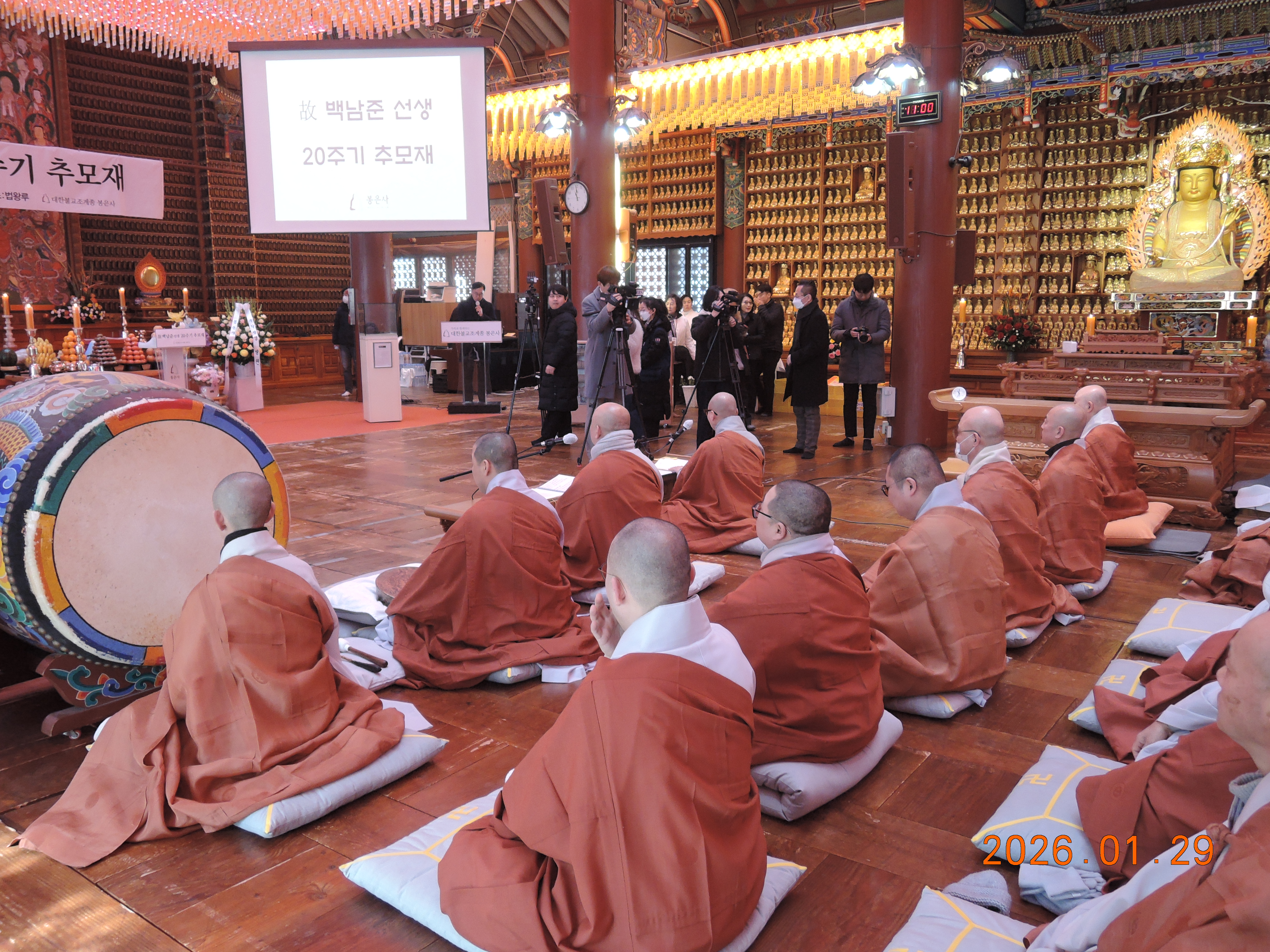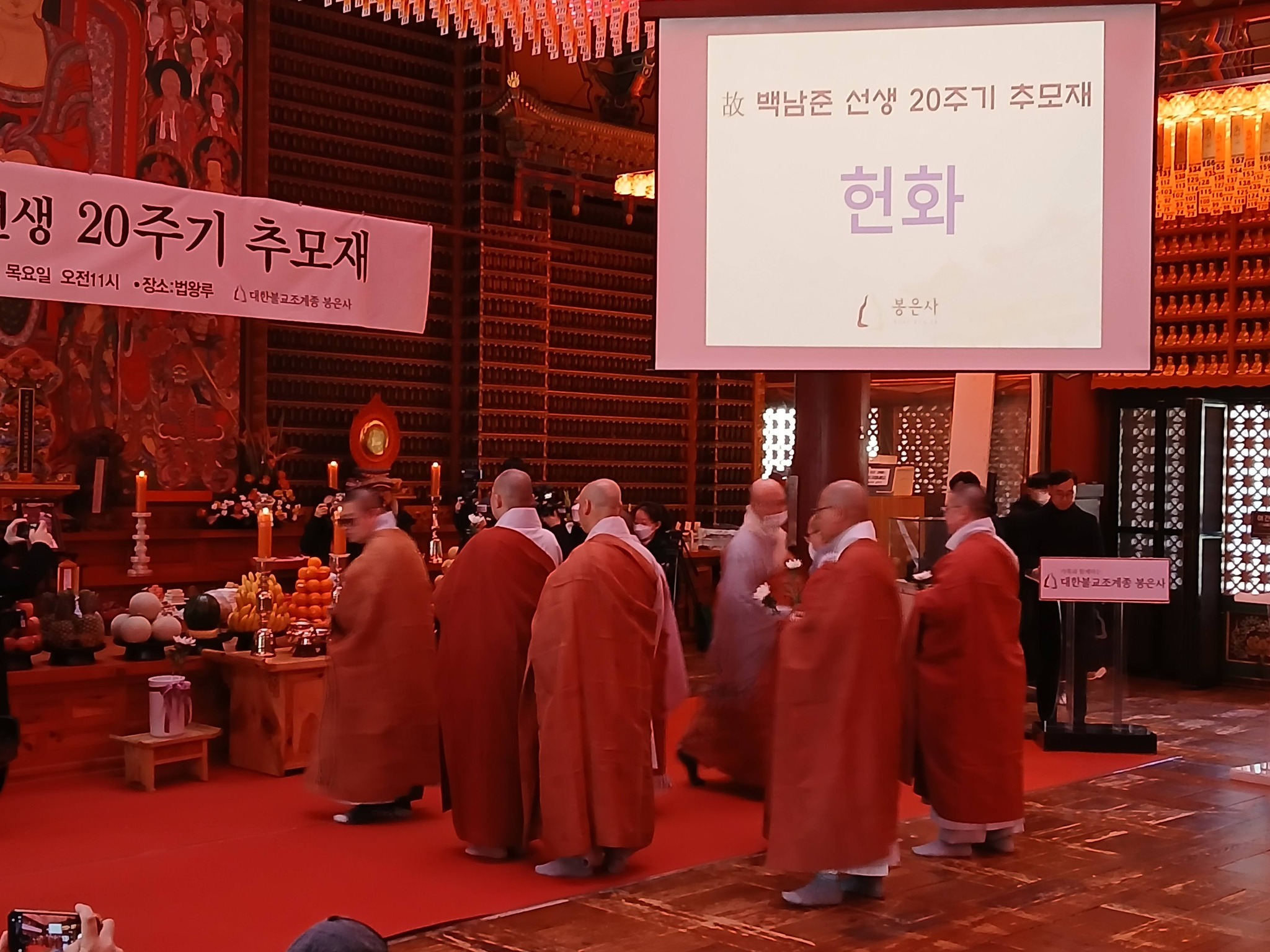 백남준은 생전 불교적 세계관인 '천지인' 사상을 작품에 담아내는 등 불교와 깊은 인연을 맺어왔다 매년 추모재가 열리는 서거 20주년을 맞아 2026년 1월 29일, 서울 봉은사 법왕루에서 추모재가 열렸다 종교계와 예술계가 인사들이 참여했다. 전 백남준 아트센트 관장 이영철 현 백남준 아트센터 박남희 관장 관련 인사들 지인들 참여했다. 주지 원명 스님은 추도사를 통해 그를 "길 없는 길을 걸은 수행자"로 기렸다 백남준 서거 20주기 추모재가 봉행되었다.