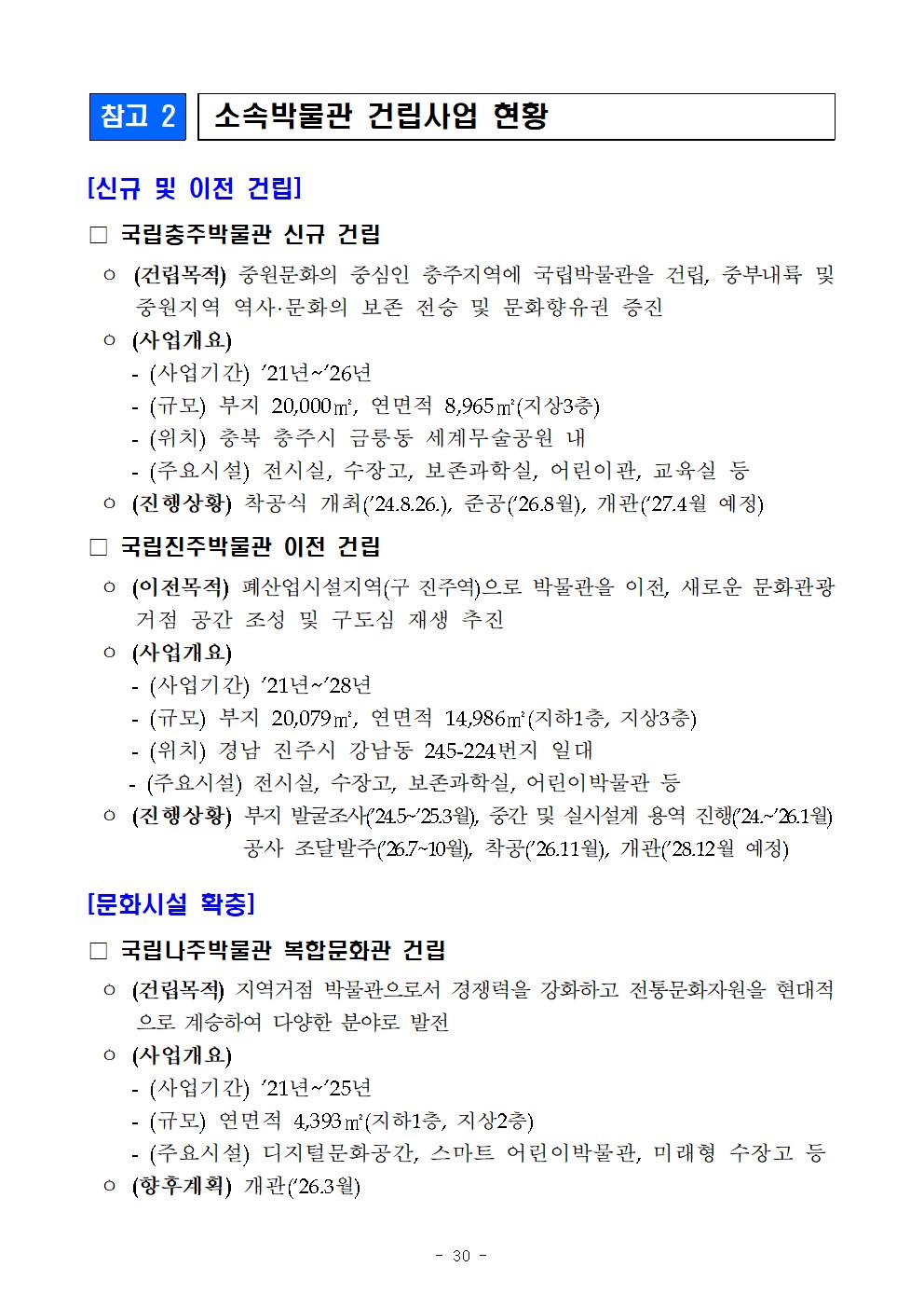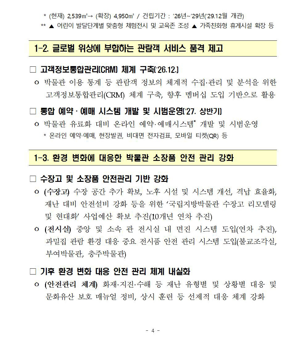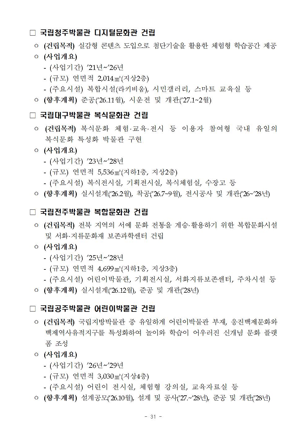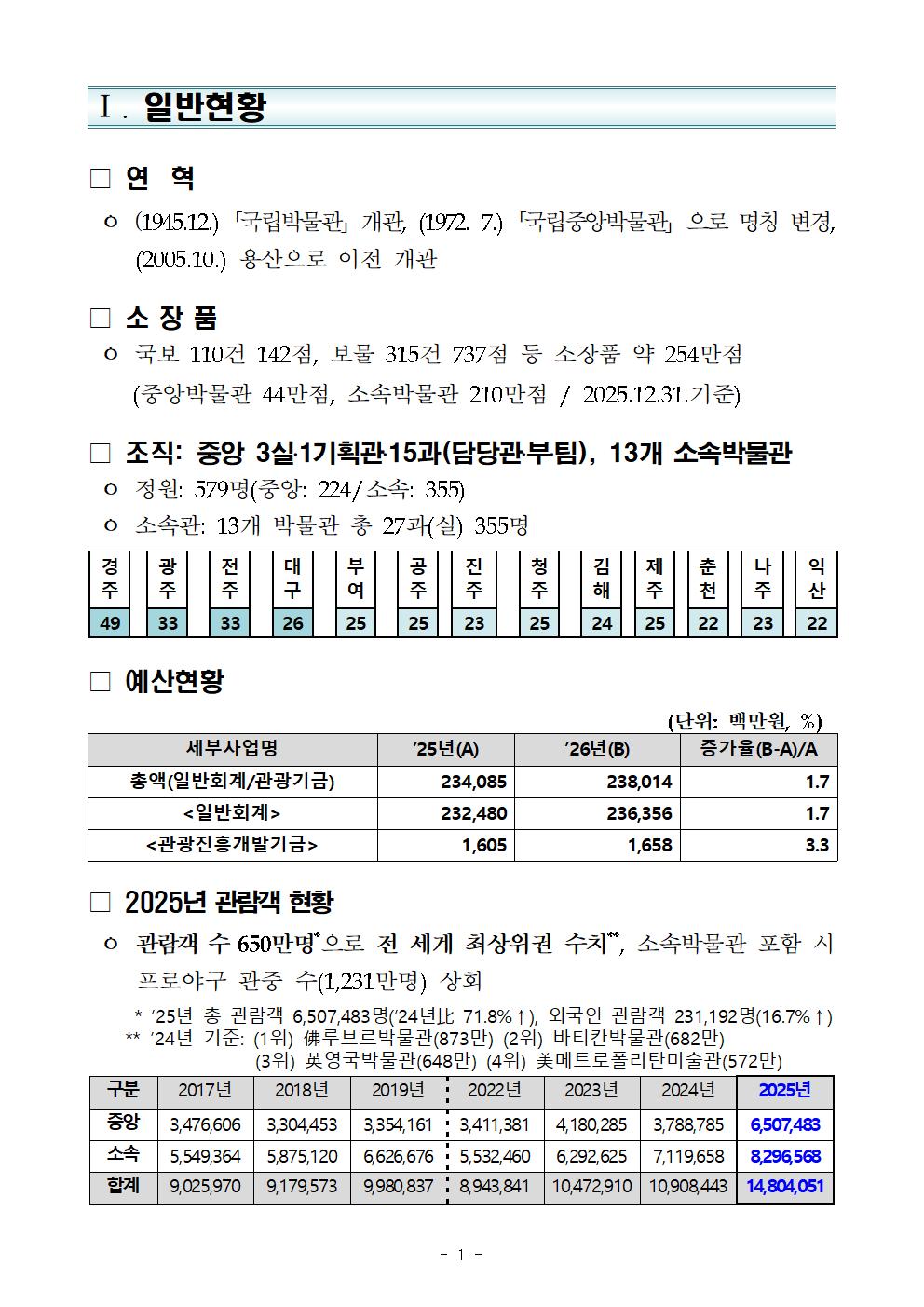 [목차] I. 일반현황 / Ⅱ. 추진방향 / III. 주요사업 1. 관람객 650만 시대, 미래를 준비하는 박물관 2. 관람객의 경험을 혁신하는 박물관 3. K-뮤지엄 자원의 가치를 확장하는 박물관 4. K-컬처의 세계 확산을 주도하는 박물관 5. 문화로 여는 지방시대를 이끌어가는 박물관 6. 사회와 공감하고 시대와 동행하는 박물관 / Ⅳ. 참고자료 1. 소속박물관 2026년 특별전시 계획 2. 소속박물관 건립사업 현황