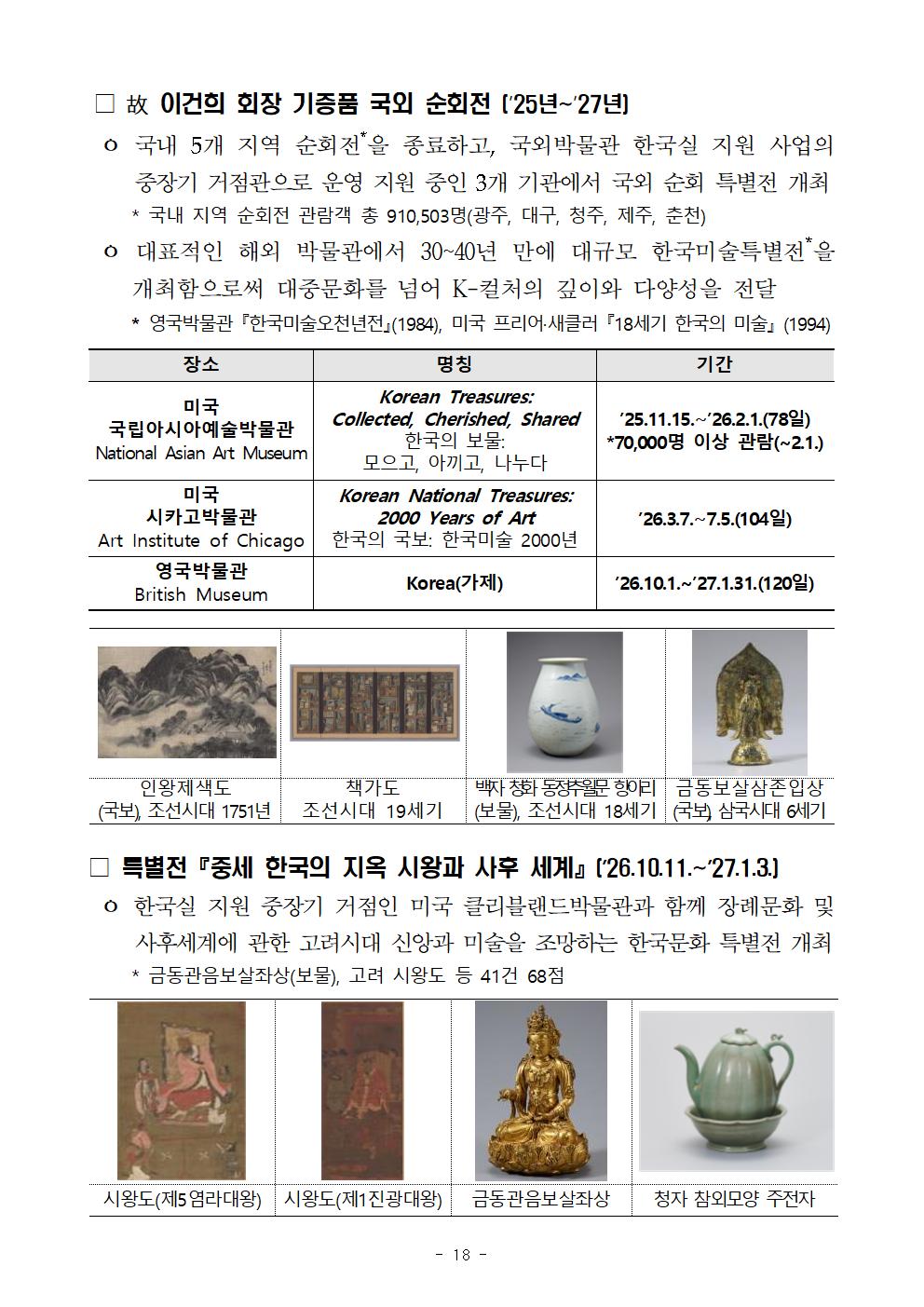 ㅇ (국외 특별전①: K-뮤지엄의 가치를 전하다) -『故이건희 회장 기증품 국외 순회전』(’ 25~‘27년/미국·영국)』(’25~‘27년/미국·영국) 국외박물관 한국실 지원 사업의 중장기 거점관으로 운영 지원 중인 3개 기관에서 순회전 개최, 미국 국립아시아예술박물관(’ 25.11.15.~2.1.),(’25.11.15.~2.1.), 미국 시카고박물관(3.7.~7.5.), 영국박물관영국박물관(10.1.~’ 27.1.31.) -『중세 한국의 지옥 시왕과 사후 세계』(10.11.~‘27.1.3./미국 클리블랜드박물관) 장례문화 및 사후세계에 관한 고려시대 신앙과 미술 조망