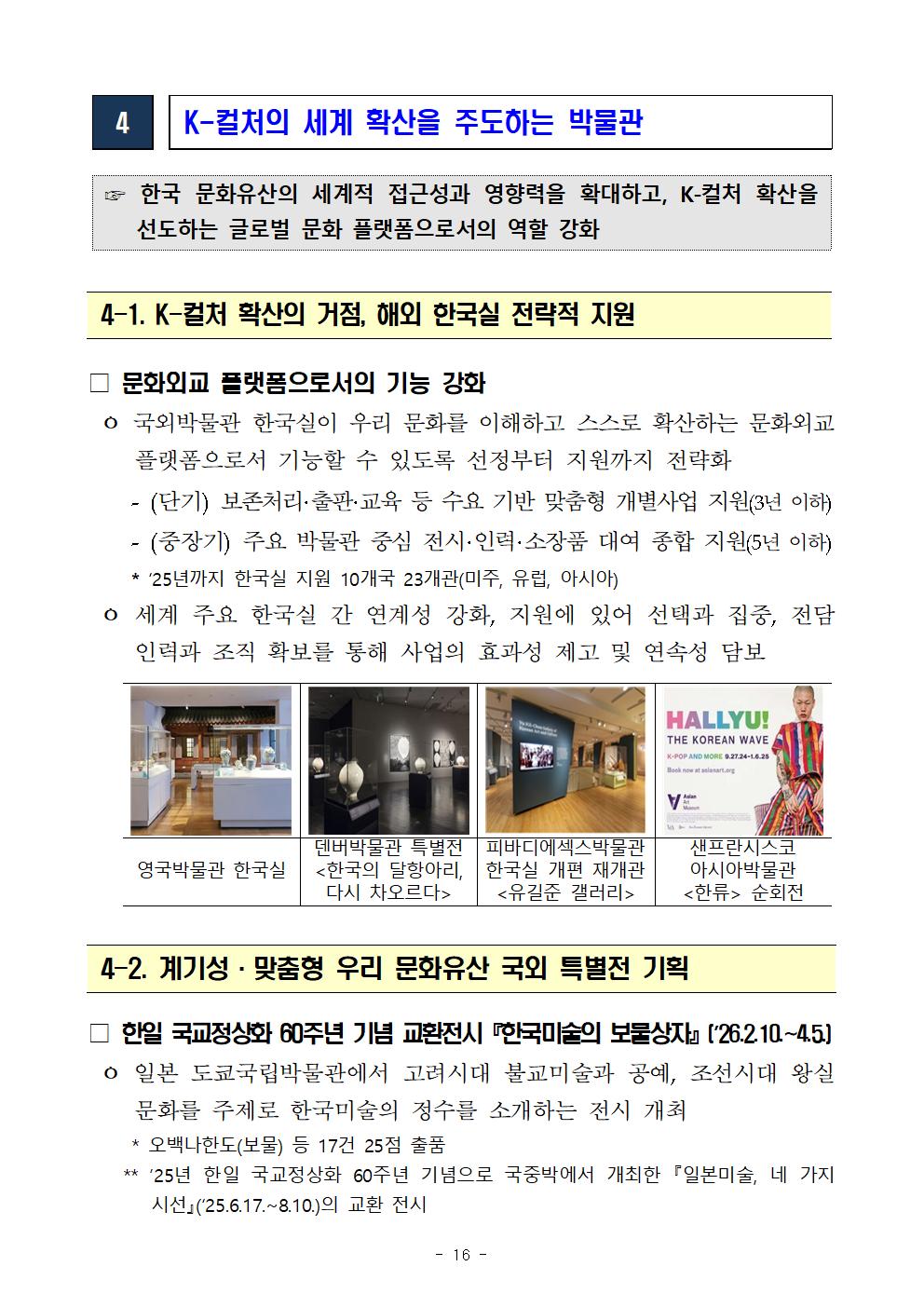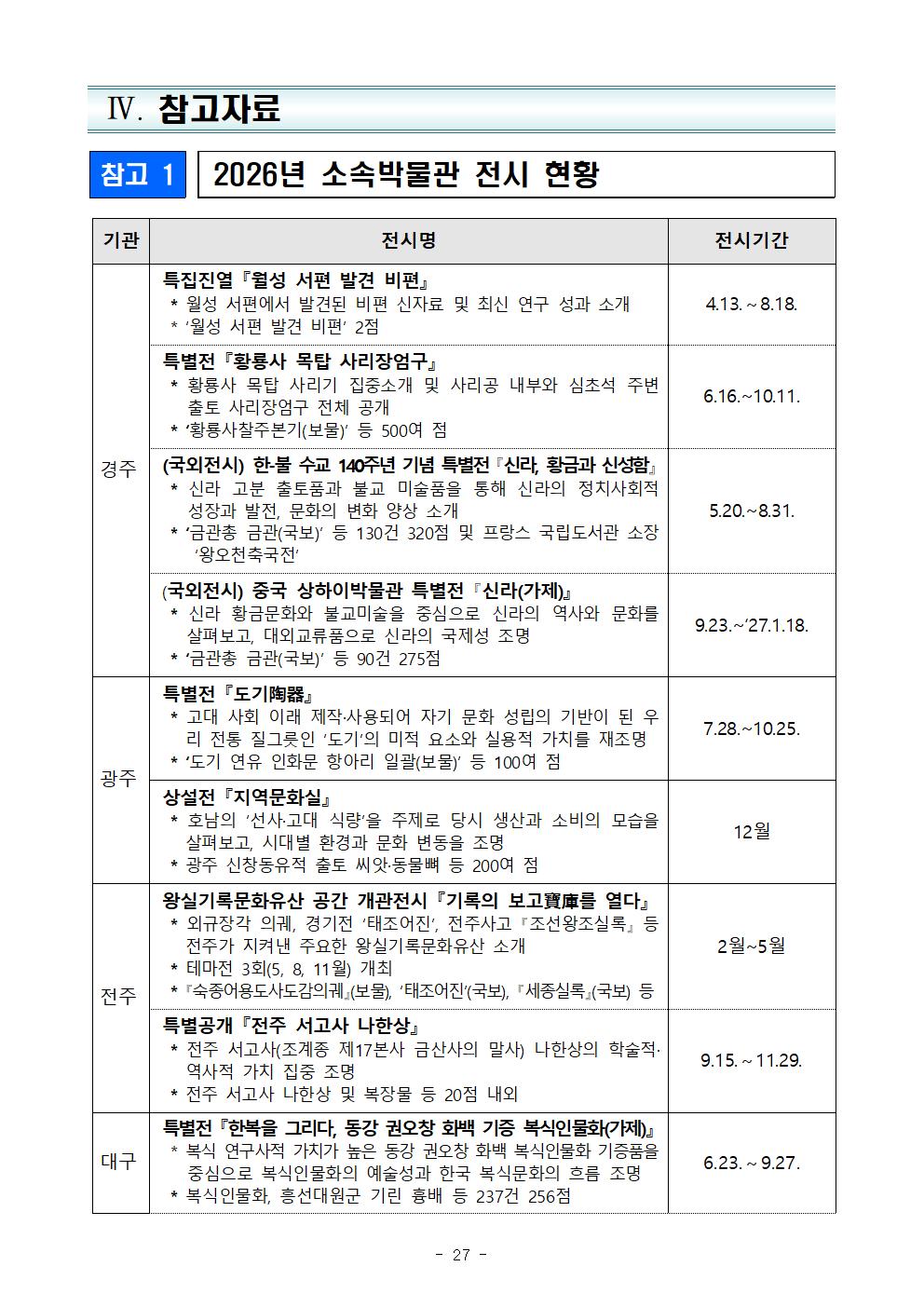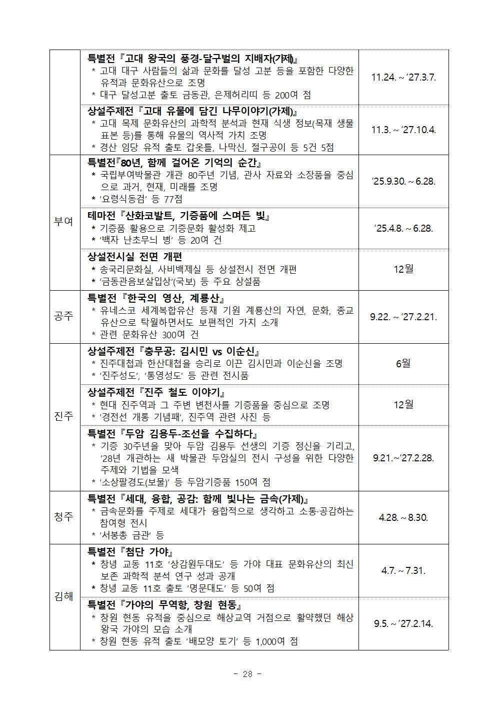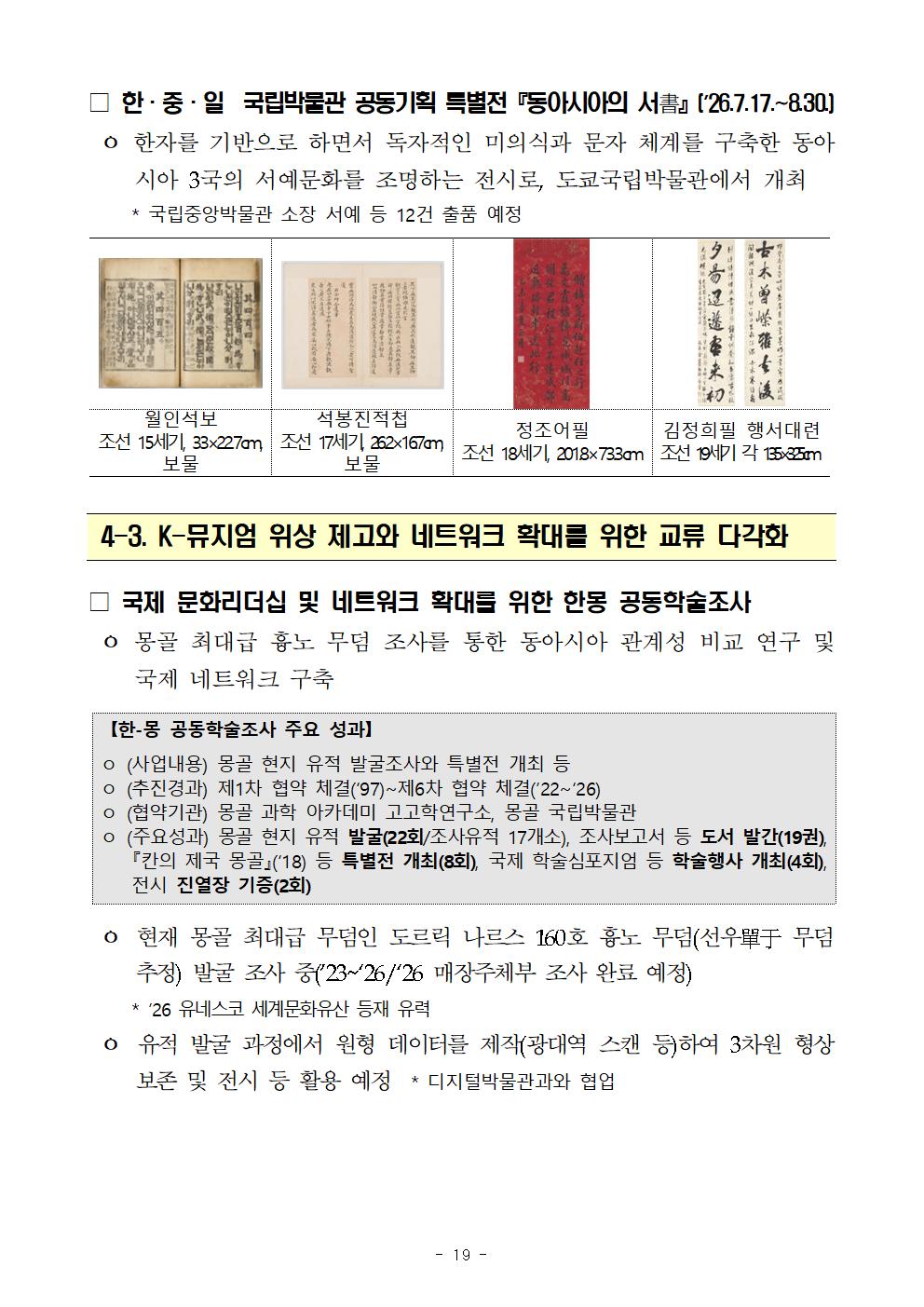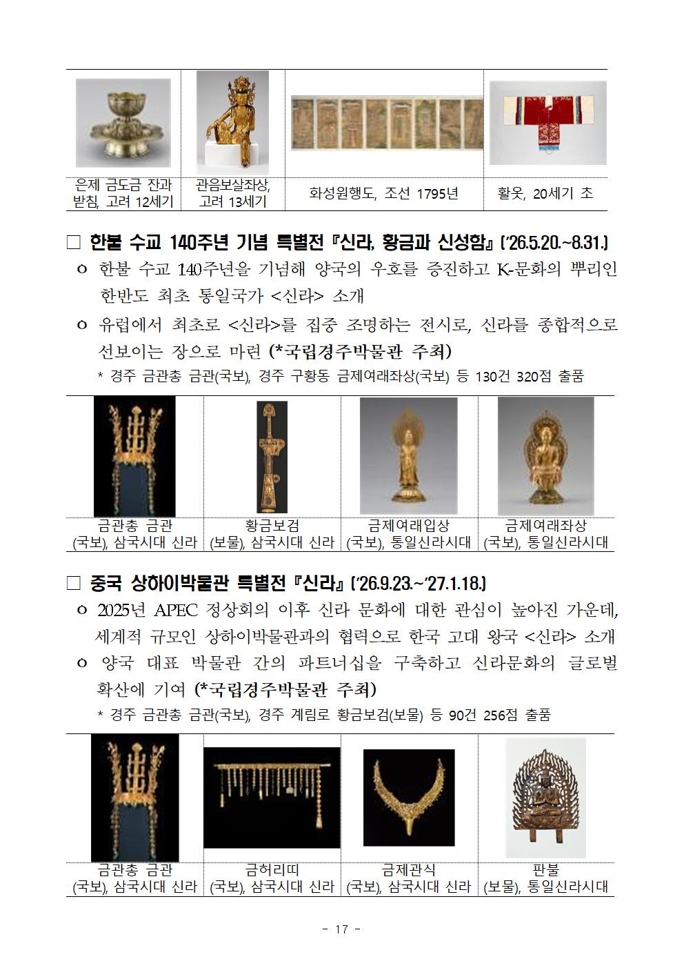 ㅇ (국외 특별전②: 문화외교의 장을 넓히다) -『한국미술의 보물상자』(2.10.~4.5./일본 도쿄국립박물관) 한일 국교정상화 60주년 기념 교환전시로, 고려시대 불교미술과 공예, 조선시대 왕실문화를 주제로 한국미술의 정수 소개 -『신라, 황금과 신성함』(5.20.~8.31./프랑스 국립 기메 아시아예술 박물관)) 한불 수교 140주년 기념 전시로, K-문화의 뿌리인 한반도 최초 통일국가 <신라> 소개 (*국립경주박물관 주최) -『신라』(9.23.~‘27.1.18./중국 상하이박물관) APEC 정상회담 이후 신라 문화에 대한 관심 고조, 한국 고대 왕국 <신라> 소개 (*국립경주박물관 주최) -『동아시아의 서書』(7.17.~8.30./일본 도쿄국립박물관) 제14회 한중일 국립박물관장회의 연계 특별전으로, 한자를 기반으로 하면서 독자적인 미의식과 문자 체계를 구축한 동아시아 3국의 서예문화 조명