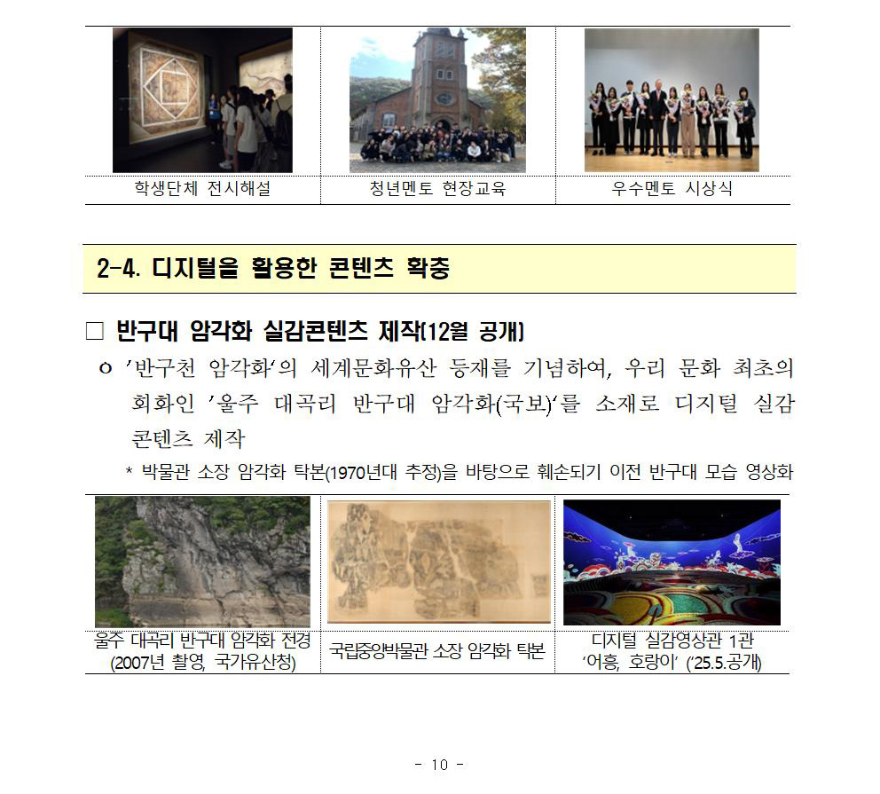 ㅇ (상설전시 운영 고도화) - 서화실 재개관(2.26.) 대표 명품을 상설화하고, 교체 시기마다 ’’ 시즌 하이라이트‘ 를 선정하여 테마전 운영 - 역사의 길『대동여지도』전시(2.12.) 관람 동선 자체를 역사 경험으로 구성한 상징적 전시 공간 조성 - 대한제국실 재공개(4월) 대한제국의 선포와 근대로의 전환의 의미를 중심으로 황제국 체제 재조명 - 주제가 있는 상설전시 순차 운영 ‘안동 봉정사 영산회 괘불’(4월), ‘화분, 화기花器가 그려진 백자’(6월), ‘둔황 불교 사경 특별공개’(10월), 최신 수증 문화유산 특별공개‘(연 3회)‘(연3회) 등 - 불교조각실 및 불교회화실 개편·재개관(12월) 불교미술 명품의 가치를 부각하고 양식·도상뿐 아니라 봉안처·의례·장인 등 맥락까지 입체적으로 조명 - 반구대 암각화 실감콘텐츠(12월) 반구대 암각화를 실감형 콘텐츠로 구현 새로운 전시 경험 제공