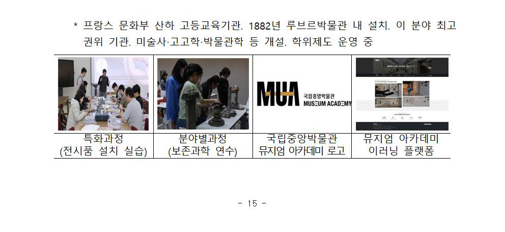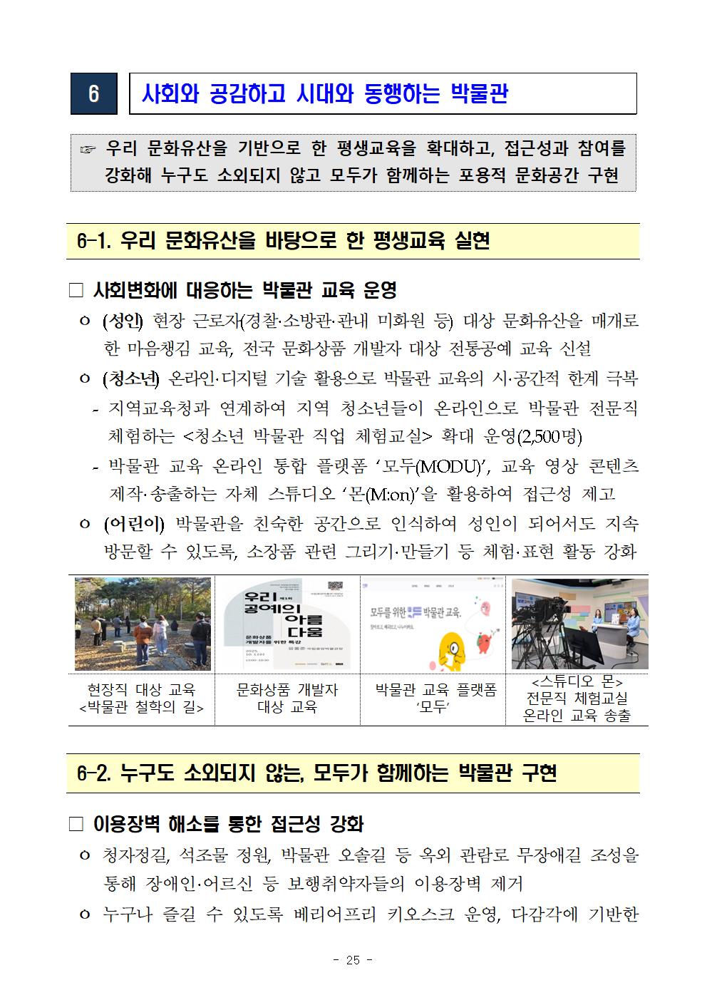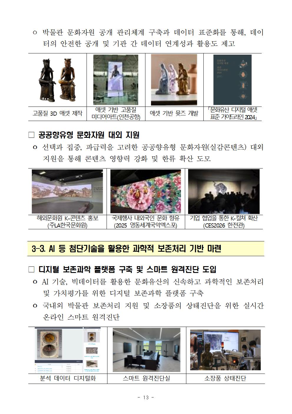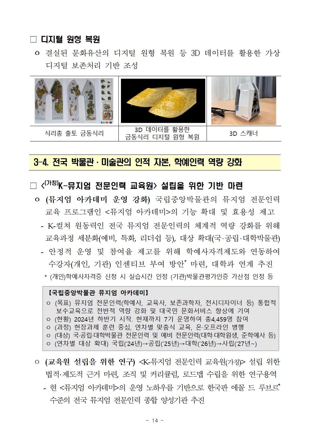 특히 조사·연구 성과를 디지털 자산과 공공 데이터로 전환해 교육·산업·콘텐츠 분야로 활용 범위를 넓히고, AI기반 보존과학 플랫폼 구축 및 디지털 큐레이션 서비스 구현을 통해 문화유산의 지속가능한 보존 기반을 마련할 계획이다. 이와 함께 뮤지엄 전문인력 양성을 위한 <뮤지엄 아카데미> 기능을 확대하고, 이를 기반으로 한 <K-뮤지엄 전문인력 교육원(가칭)> 설립 준비를 통해 K-뮤지엄의 지속가능한 경쟁력을 체계적으로 강화해 나간다.