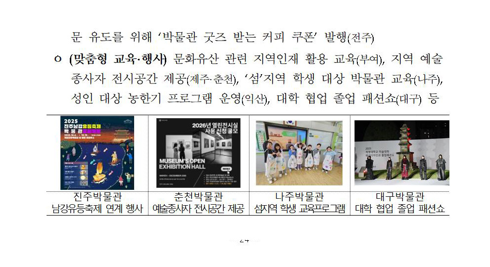 국립중앙박물관은 문화 향유의 기회를 지역과 일상으로 확장하며, 지역과 함께 성장하는 박물관을 본격화한다. 이를 위해 ’’ 찾아가는 전시‘, ’ 지역 고유 브랜드 육성‘, ’ 문화 인프라 확충‘을 중심으로 지방시대를 문화로 뒷받침하는 지역 협력 정책을 추진한다.