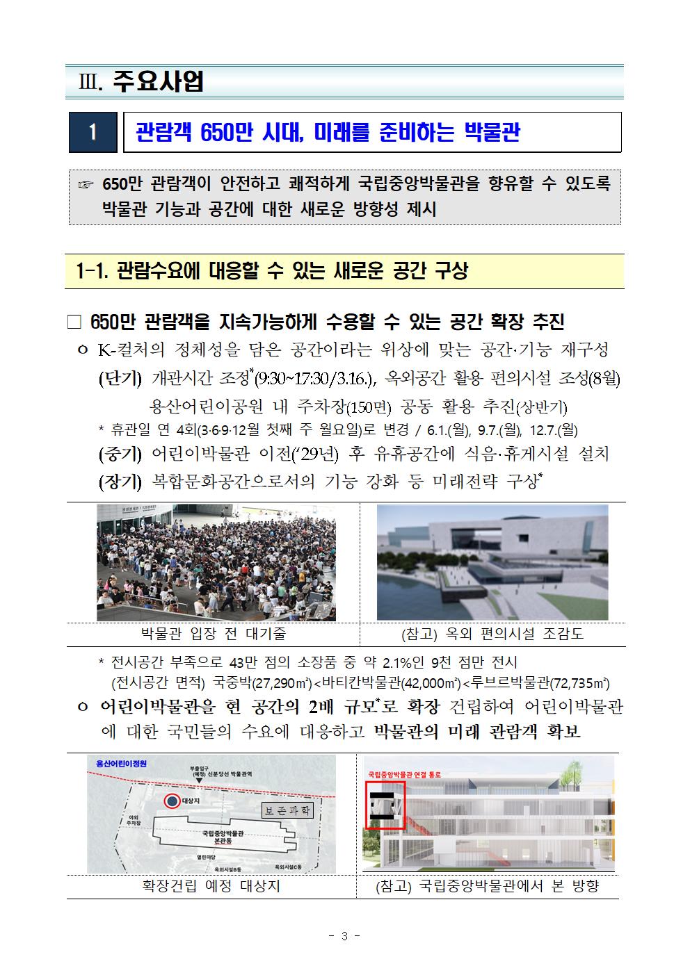국립중앙박물관은 이러한 운영 개선과 전시·관람 기반의 단계적 보완을 통해 전시 중심의 관람을 넘어 일상 속 문화 향유가 이루어지는 복합문화공간으로 기능을 확장한다는 구상이다.