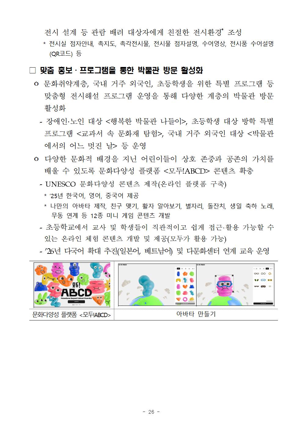 - 관람의 풍경을 바꾸고, 한국 문화의 깊이를 세계와 나누며, 지역과 일상이 이어지는 박물관으로 - <2026년 핵심 추진 전략: 미래 관람 환경과 경험의 혁신 K-뮤지엄 자원의 가치 확장과 세계화 지역·사회와 함께하는 포용적 박물관