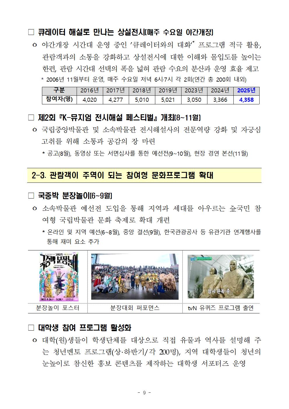 특히 상설전시 운영의 전략화를 위해 서화실 재개관을 계기로 ’’ 시즌 하이라이트‘ 등 주제 중심 전시와 콘텐츠 순환을 강화하고, 전시·해설·서비스 전반에서 관람객의 이해와 참여를 높이는 경험 중심 운영 체계를 구축한다. 수요일 야간 개장 시간대에는 ’’ 큐레이터와의 대화‘ 프로그램을 적극 활용해 관람객과의 직접 소통을 확대하고, 관람 시간대 선택의 폭을 넓혀 관람 수요의 분산과 운영 효율 제고를 도모한다. 이와 함께 국립중앙박물관과 소속박물관의 전시해설사들이 참여하는 ’K-뮤지엄 전시해설 페스티벌‘(8~11월)을 개최해 전시해설 역량을 체계적으로 강화한다. 박물관의 힘은 무엇을 소장하느냐보다 그것을 어떻게 이해하느냐에 의해 완성된다. 이번 페스터벌은 전시해설사의 전문성과 해석 역량을 공유·확산하는 실천형 학습의 장으로, 언제 찾아도 새롭게 읽히는 박물관을 구현하는 데 목적이 있다.