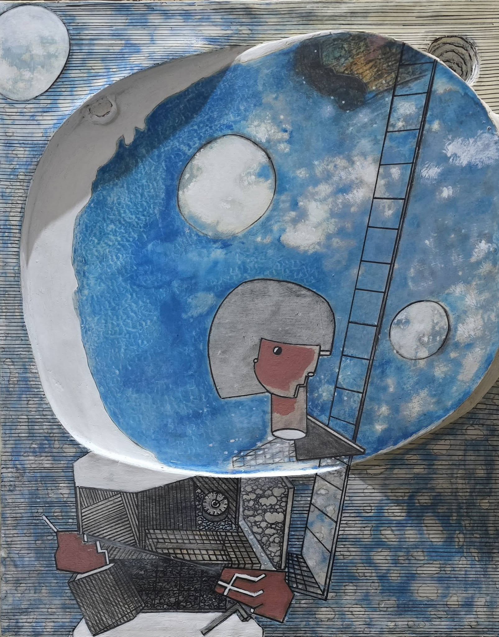 <현대사회의 갈등과 대립을 자기 자리의 이탈>이라는 시각으로 바라보며 달 항아리(완벽한 평화)에 두터운 마티에르에 담아 메시지를 전하고 있다 차분한 흙빛 색조를 통해 시간과 기억의 층위를 화면에 쌓아올린다. 이 암흑의 시대에 형태/가치-내용/의미-생명/존재성을 회복하는 가능성을 암시하다