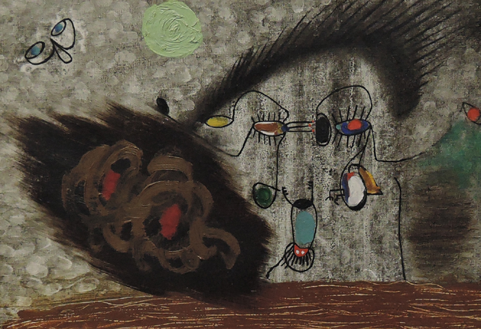 첫 번째 주제에서는 고전적 미술 언어의 틀을 깨는 아스거 욘의 초기 작업(1930~40년대)을 살펴본다. 욘은 예술은 하나로 정의될 수 없으며 지속적인 변화를 필요로 한다고 보았다. 이를 위해 욘은 피카소나 미로 등의 작품을 자신만의 방법으로 표현한 ‘전환’을 시도하며 다양한 회화 작품을 선보인다. 아래 작품이 그런 화풍이다.