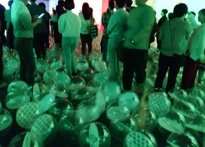 전시장 바닥에 풍선이 발길에 닿으면 너무나 경쾌해지고 마치 하늘을 날 것 같이 몸이 가벼워지고 마음이 들뜨게 된다. 그렇게 되면 자연히 몸을 흔들게 되고 그러면 여기에 온 사람들은 목 디스크 허리 디스크가 없어지고 하늘을 하는 한마리 새가 되거나 하늘을 수놓는 새가 되기도 한다. 그 풍선이 주는 감촉은 정말 촉각적이다.