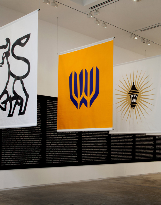 갤러리 한쪽 벽면을 장식하는 <Bankrupt Banks>는 2008년 세계 금융 위기 당시 파산을 선언하고 여타 금융 및 정부 기관에 인수된 은행들의 로고를 회화의 형태로 번안한 작업이다. 한때 권위와 자신감의 상징으로 기능토록 고안된 로고들이 이제는 더 이상 유효하지 않은 상징물, 실패한 권력구조의 초상이 되어 내걸린다.