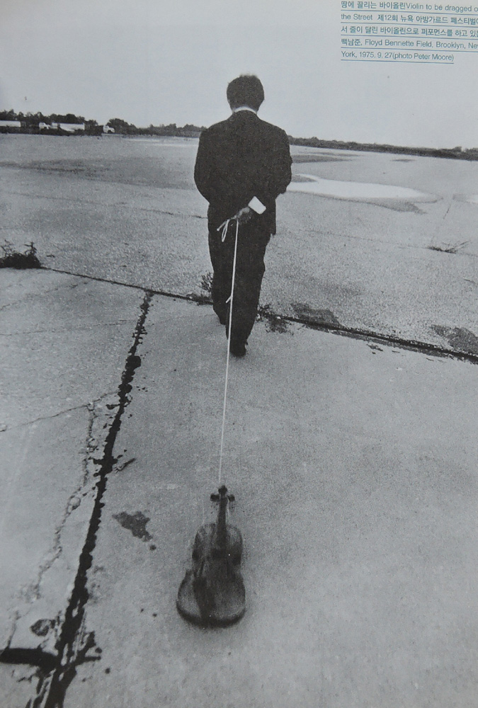 백남준 서양악기의 신이라고 할만한 바이올린에 목줄을 달고 그 '음악의 신'을 질질 끌고 다녔다. 정말 백남준다운 파격미다. 그는 이 퍼포먼스를 평생을 했다. 그는 주저 없이 서양의 음악신, 악기신을 죽인 것이다. 그는 바로 미술계의 니체였던 것이다. 사진 1975년 12회 뉴욕 전위 미술 축제 때 퍼포먼스 작품이다 그리고 그 비싼 피아노들 얼마나 때려부셨던가! 부잣집 아들 답다. 백남준은 정말 재미있는 사람이다. 장난기를 똘똘 뭉친 사람이다. 세계에서 이렇게 배포가 큰 사람을 본 적이 없다. 세계 유명 작가 중 백남준처럼 어린 시절 3300평 집에 산 사람도 없을 것 같다. 자신의 하고 싶은 것을 다 하고 이 세상을 떠난 그는 천상 예술가다. 세계를 호령한 문화칭기즈칸 그를 생각하는 것만으로도 속이 확 풀린다 그를 상상하는 것만으로도 하루가 통쾌해진다.
