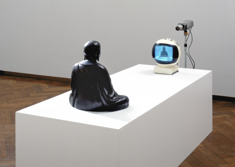 Nam June Paik, TV-Buddha, 1974. Collection Stedelijk Museum Amsterdam. Photo: Stedelijk Museum Amsterdam. Nam June Paik, TV Garden, 1974-1977 (2002). Kunstsammlung Nordrhein-Westfalen, Düsseldorf © Estate of Nam June Paik